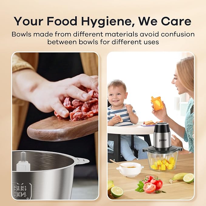 • 【Unlock Versatility with Two Bowls】Your food hygiene, we care. The Mixing Bowls are made from different materials (glass and sus 304 stainless steel) to avoid confusion between bowls for different uses, meat chopper and vegetable chopper, food processor.